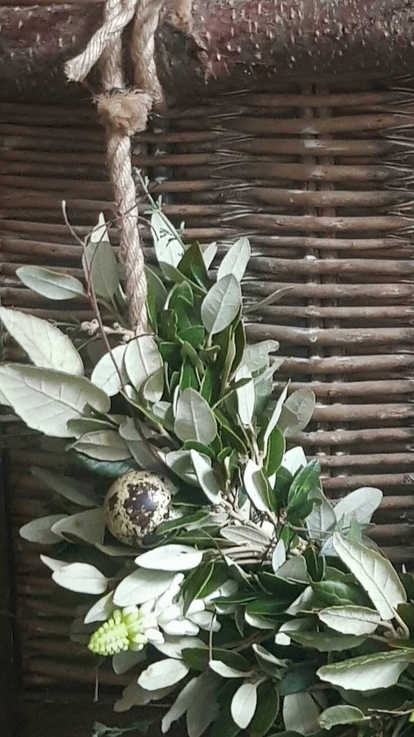 leuke guirlande aan stok opgemaakt met steeneik en wilde thijm afgewerkt met eitjes (voorjaar/pasen)