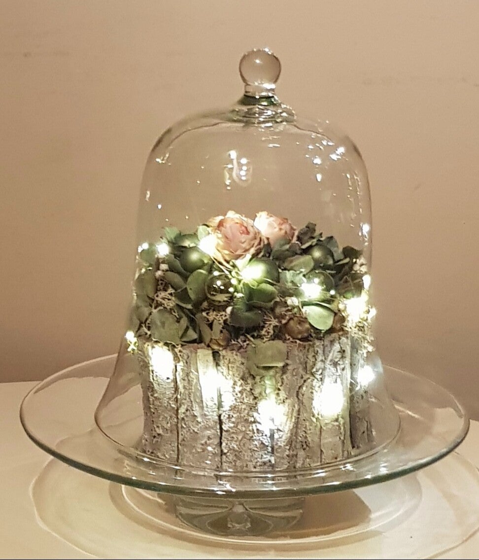 Grote glazen stolp met glazen schaal doorsnee 35 cm en hoogte stolp 35 cm